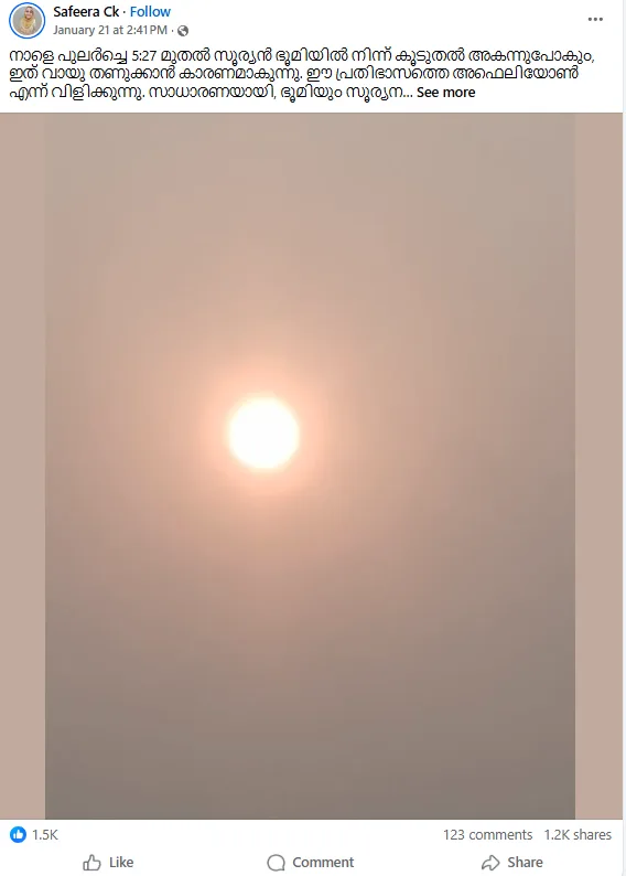 “നാളെ പുലർച്ചെ 5:27 മുതൽ സൂര്യൻ ഭൂമിയിൽ നിന്ന് കൂടുതൽ അകന്നുപോകും, ഇത് വായു തണുക്കാൻ കാരണമാകുന്നു. ഈ പ്രതിഭാസത്തെ അഫെലിയോൺ എന്ന് വിളിക്കുന്നു.” എന്ന് തുടങ്ങുന്ന പോസ്റ്റ് കഴിഞ്ഞ കുറച്ചു മണിക്കൂറുകൾക്കുള്ളിൽ വൈറൽ ആയിട്ടുണ്ട് സഫീറ സി കെ എന്ന ഒരു ഫേസ്ബുക്ക് അക്കൗണ്ടിലൂടെ മാത്രം ആയിരത്തിലധികം പേരാണ് ഈ പോസ്റ്റ് ഷെയർ ചെയ്തത്. ആയിരത്തി അഞ്ഞൂറോളം പേര് ലൈക് ചെയ്തതായും കാണാം.