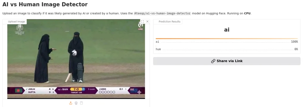 ചിത്രത്തിൽ കാണുന്ന കളിക്കാരുടെ വേഷം നിക്കാബായിരുന്നില്ല. ദി ന്യൂ ഇന്ത്യൻ എക്സ്പ്രസ്, ബിബിസി, ഇന്ത്യ ടുഡേ തുടങ്ങിയ മാധ്യമ റിപ്പോർട്ടുകളിലും നിക്കാബ് ധരിച്ച ക്രിക്കറ്റർമാരെ കണ്ടില്ല. ചിത്രം എഐ v/s ഹ്യൂമൺ ഇമേജ് ഡിറ്റെക്ടർ ഉപയോഗിച്ച് പരിശോധിച്ചപ്പോൾ, അത് എ ഐ നിര്മ്മിത ചിത്രമാണെന്ന് മനസ്സിലായി.