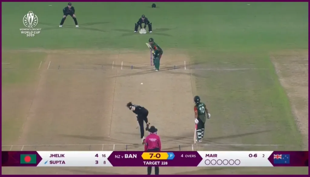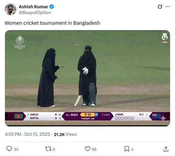 വനിതാ ക്രിക്കറ്റ് ലോകകപ്പില്, ന്യൂസിലാൻഡിനെതിരായ മത്സരത്തില് ബംഗ്ലാദേശി കളിക്കാര് നിഖാബ് ധരിച്ച് മൈതാനത്ത് നിൽക്കുന്ന ചിത്രങ്ങൾ ചില സമൂഹ മാധ്യമ അക്കൗണ്ടുകൾ വഴി പ്രചരിച്ചിരുന്നു. ഒക്ടോബര് 10 ന് അസമിലെ ഗുവാഹത്തിയിലായിരുന്നു ഈ കളി. നിഖാബ് ധരിച്ച രണ്ട് ബാറ്റര്മാര് ക്രീസിൽ സംസാരിച്ചു നിൽക്കുന്ന ഒരു ചിത്രമാണ് വൈറലായത്. ചിത്രത്തിലെ ഗ്രാഫിക്സില് നിന്ന് ബാറ്റര്മാരുടേയും ബൌളറുടേയും പേരും വ്യക്തമാണ്. അതു പ്രകാരം പ്രകാരം നാലാം ഓവറിന്റെ തുടക്കത്തിലെടുത്ത ചിത്രമാണിതെന്നും മനസ്സിാക്കാനാവും. ‘ബംഗ്ലാദേശിൽ നടക്കുന്ന വനിതാ ക്രിക്കറ്റ് ടൂർണമെന്റ്’ എന്ന അടിക്കുറിപ്പോടുകൂടി ഒക്ടോബർ 13 നാണ് ചിത്രം എക്സ് അക്കൗണ്ട് വഴി പ്രചരിച്ചത്. 21,000 ആളുകളാണ് ചിത്രം കണ്ടത്.
