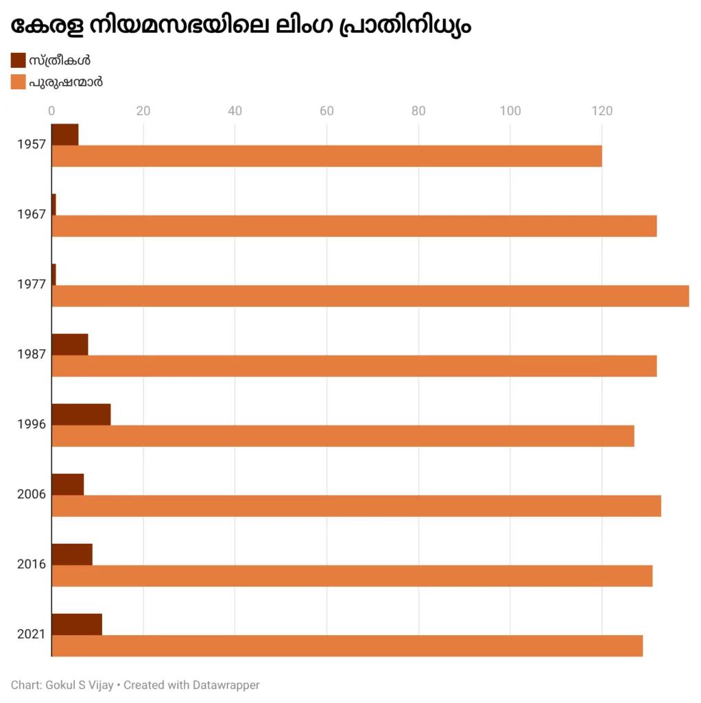 1957 ൽ കേരളം രൂപീകൃതമായത് മുതൽ 2021 ലെ തിരഞ്ഞെടുപ്പ് വരെ കേരളനിയമസഭയിലേക്കെത്തിയത് 100 സ്ത്രീകളാണ്. അതായത് നാളിതു വരെ തെരഞ്ഞെടുക്കപ്പെട്ട ഏകദേശം രണ്ടായിരം എംഎൽഎ മാരിൽ അഞ്ച് ശതമാനത്തിൽ താഴെ.