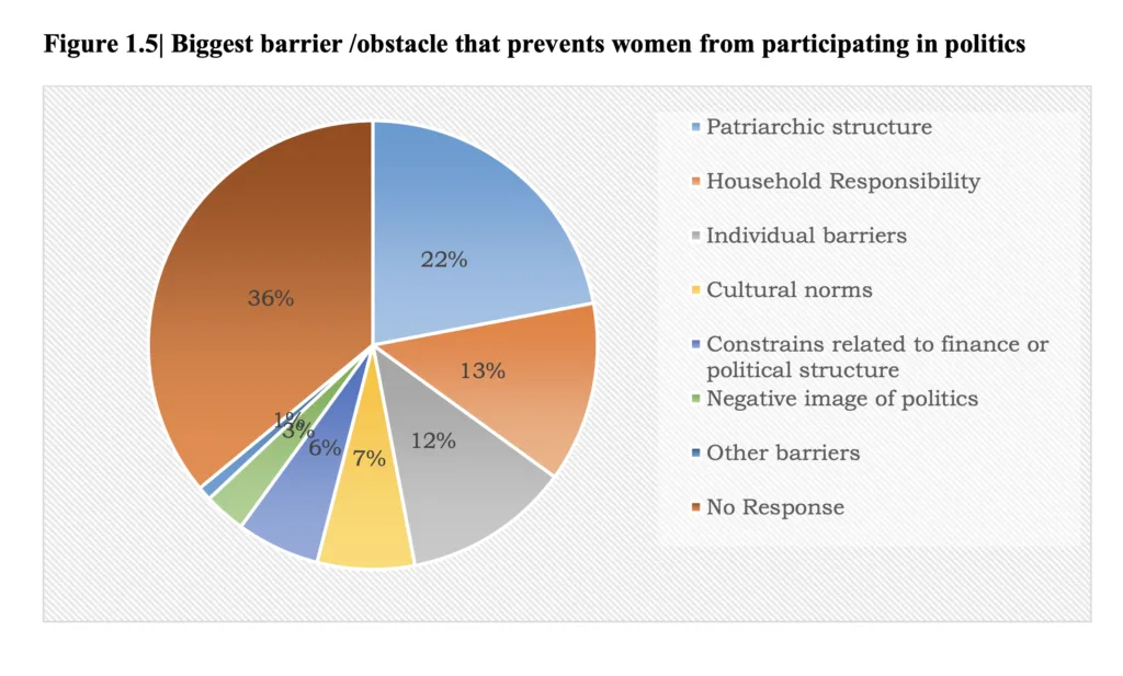 CSDS പഠനമനുസരിച്ച്, രാഷ്ട്രീയ പങ്കാളിത്തത്തിൽ നിന്ന് തടഞ്ഞ് നിർത്തുന്ന ഘടകങ്ങളെ പറ്റി ചോദിക്കുമ്പോൾ 22 ശതമാനം സ്ത്രീകളും ചൂണ്ടിക്കാട്ടുന്നത് സമൂത്തിലെ ആൺ മേൽക്കോയ്മയെയാണ്. 13 ശതമാനം സ്ത്രീകൾ വീട്ടുത്തരവാദിത്തങ്ങളും കാരണമായി പറയുന്നു.