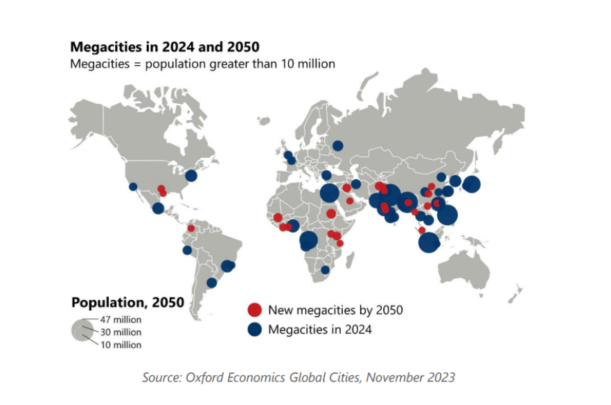 2050-ഓടെ ആഗോളതലത്തിൽ മെഗാ സിറ്റികളുടെ എണ്ണം 37 ആയി ഉയരുമെന്നു പഠനം പറയുന്നുണ്ട്. പുതിയ മെഗാ സിറ്റികളുടെ പ്രവചന പട്ടികയിൽ, അഡിസ് അബാബ (എത്യോപ്യ), ദാര് എസ് സലാം (യുണൈറ്റഡ് റിപ്പബ്ലിക് ഓഫ് ടാൻസാനിയ), ഹാജിപൂർ (ഇന്ത്യ), ക്വാലാലംപൂർ (മലേഷ്യ) എന്നീ നഗരങ്ങളാണുള്ളത്.