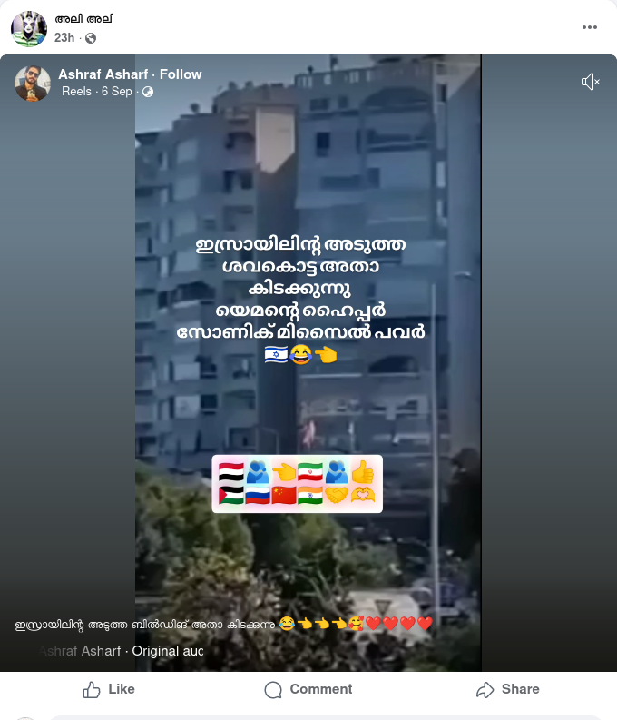 ‘ഇസ്രയേലിന്റെ അടുത്ത ബിൽഡിങ് അതാ കിടക്കുന്നു” എന്ന അടിക്കുറിപ്പോടെ ഒക്ടോബർ 20 ന് ഒരു ഫേസ്ബുക്ക് അക്കൗണ്ട് വഴിയാണ് വീഡിയോ പ്രചരിച്ചുതുടങ്ങിയത്. ‘ഇസ്രയേലിന്റെ അടുത്ത ശവക്കോട്ട അതാ കിടക്കുന്നു യമന്റെ ഹൈപ്പർ സോണിക്ക് മിസൈൽ പവർ’ എന്ന് വീഡിയോയ്ക്ക് മുകളിലും എഴുതിയിട്ടുണ്ട്.