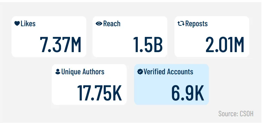 മുസ്ലിം വിരുദ്ധവും, അപര വിദ്വേഷം ജനിപ്പിക്കുന്നതും, ഒറ്റപ്പെടുത്തുന്നതുമായ ഭാഷയുപയോഗിക്കുന്ന 35,522 പോസ്റ്റുകളാണ് പഠനത്തിന്റെ ഭാഗമായി എക്സിൽ മാത്രം കണ്ടെത്തിയത്. ഇതിൽ 6868 (39%) അക്കൗണ്ടുകളും വെരിഫൈഡ് അക്കൗണ്ടുകളാണ്. 16,039 പോസ്റ്റുകളിൽ നിന്നായി മുസ്ലിം വിരുദ്ധ ഉള്ളടക്കത്തിന്റെ 45 ശതമാനവും ഈ അക്കൗണ്ടുകളിൽ നിന്നാണ് വന്നിട്ടുള്ളത്.