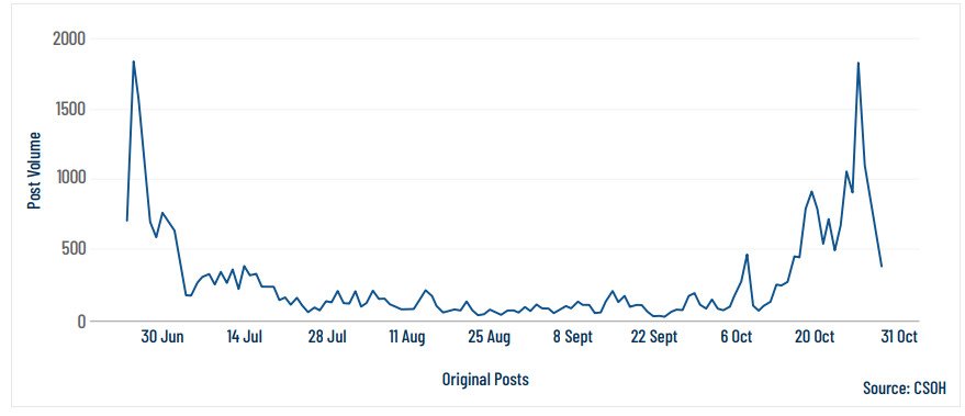 പഠനം നടത്തിയ നാലു മാസ കാലയളവിൽ, മുസ്ലിം വിരുദ്ധ പോസ്റ്റുകളുടെ എണ്ണം ക്രമാനുഗതമായി വർദ്ധിച്ചു വരികയായിരുന്നു. ഒക്ടോബറിൽ ഇത്തരം പോസ്റ്റുകൾ 15,123 (ആകെ ഡാറ്റയുടെ 43%) എന്ന ഭീമമായ സംഖ്യയിലേക്ക് ഉയർന്നു. സെപ്റ്റംബറിൽ നിന്ന് 450 ശതമാന വർദ്ധനയാണിത്. തെരെഞ്ഞെടുപ്പിന്റെ അവസാന ഘട്ടത്തിലേക്ക് അടുത്തപ്പോൾ, മുസ്ലിം വിരുദ്ധ ആഖ്യാനങ്ങൾ ശക്തിപ്പെടുത്താനുള്ള സംഘടിത ശ്രമങ്ങളുടെ ഭാഗമായിട്ടാകാം ഈ വർദ്ധന ഉണ്ടായതെന്ന് റിപ്പോർട്ട് നിരീക്ഷിക്കുന്നു.