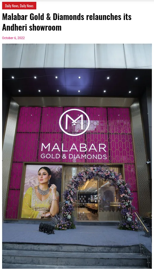 The article discusses the 2022 relaunch of Malabar Gold & Diamonds showroom in Andheri, Mumbai, Maharashtra, clarifying that the image is not recent and not linked to the recent boycott trend against the brand.