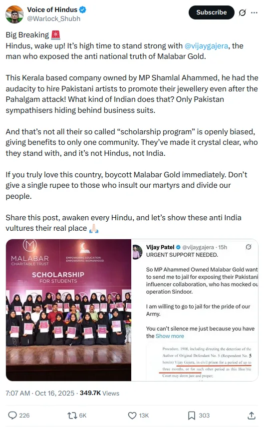 An X(formerly Twitter) user shared a photo tagging an activist and reporter at OnlyFacts on October 16, 2025, with the caption,“Big Breaking, Hindus, wake up! It’s high time to stand strong with @vijaygajera, the man who exposed the anti national truth of Malabar Gold. This Kerala based company owned by MP Shamlal Ahammed, he had the audacity to hire Pakistani artists to promote their jewellery even after the Pahalgam attack! What kind of Indian does that? Only Pakistan sympathisers hiding behind business suits. And that’s not all their so called “scholarship program” is openly biased, giving benefits to only one community. They’ve made it crystal clear, who they stand with, and it’s not Hindus, not India. If you truly love this country, boycott Malabar Gold immediately. Don’t give a single rupee to those who insult our martyrs and divide our people. Share this post, awaken every Hindu, and let’s show these anti India vultures their real place.” The post received around 3,49,700 views, 13,000 likes, and 6,000 likes.