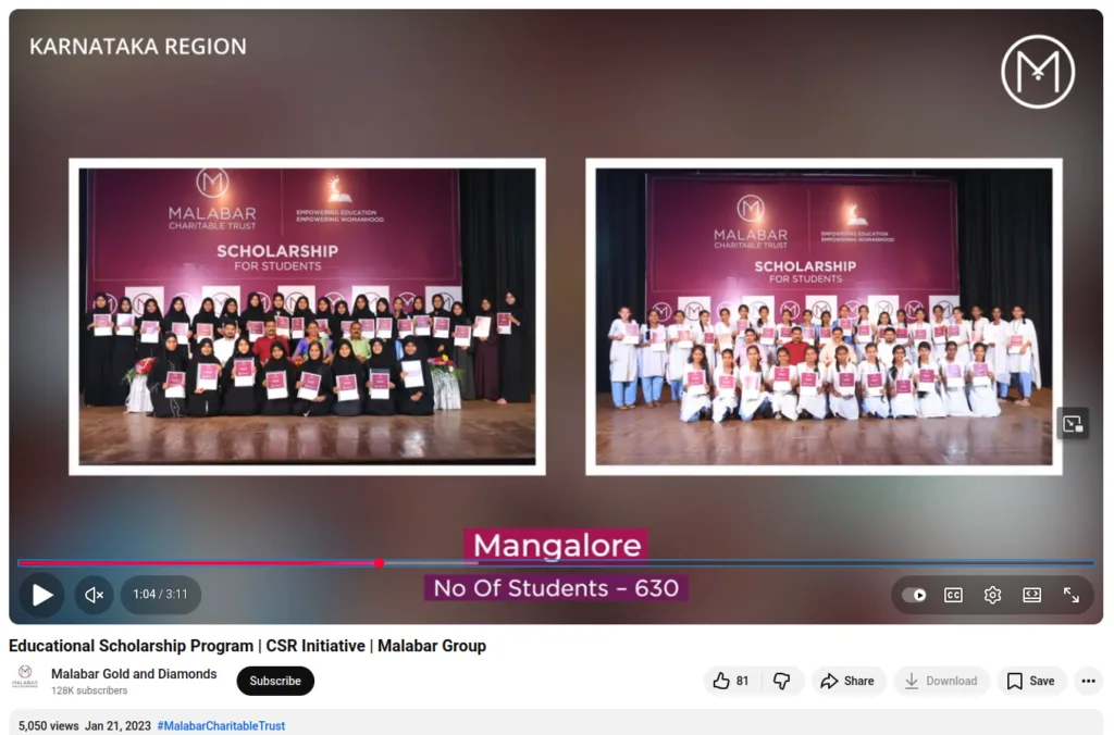 We performed a keyword search using keywords such as “Malabar Gold & Diamonds” and “scholarship” and found a YouTube video dated January 21, 2023, on the official YouTube channel of Malabar Gold and Diamonds. The video is titled,”Educational Scholarship Program | CSR Initiative | Malabar Group (sic).” At 1:03 minutes, the viral photo is visible.