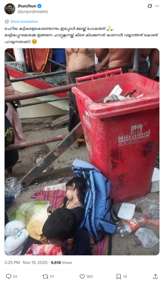 A X(formerly Twitter) user shared a photo on November 19, 2025, with a Malayalam caption that translates to, “Please don’t take small children to the Sabarimala. I’m saying this because it’s heartbreaking to see a Malikapuram lying under a dustbin.” Malikappuram is a term used for young female devotees under the age of ten who travel to Sabarimala, and it also denotes a shrine dedicated to a Hindu goddess located near the temple