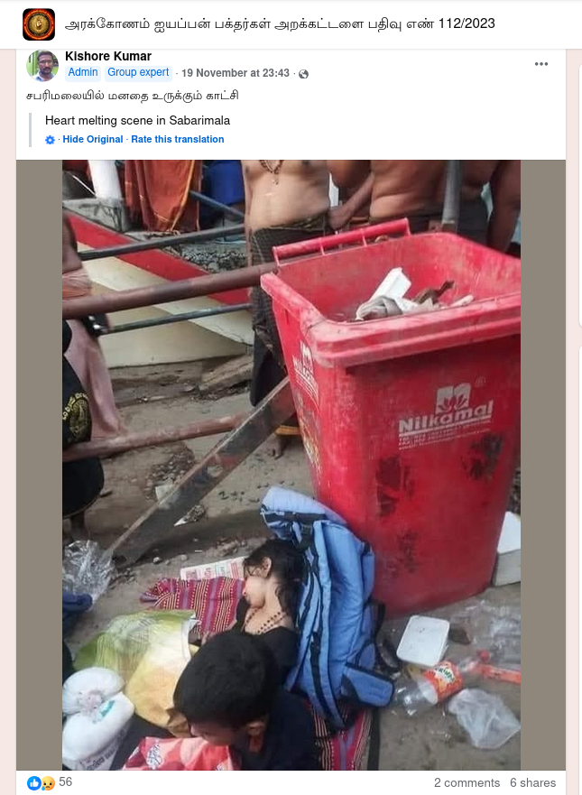 The admin of a Facebook group “Arakkonam Ayyappa Devotees Trust Registration No. 112/2023,” Kishore Kumar, also shared this image on the same day with a similar caption in Tamil.