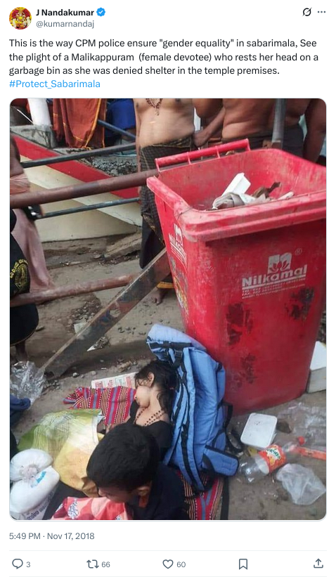 An X user shared the photo on November 17, 2018, under the hashtag #Protect_Sabarimala with the caption, “This is the way CPM police ensure “gender equality” in sabarimala, See the plight of a Malikappuram (female devotee) who rests her head on a garbage bin as she was denied shelter in the temple premises. #Protect_Sabarimala.”