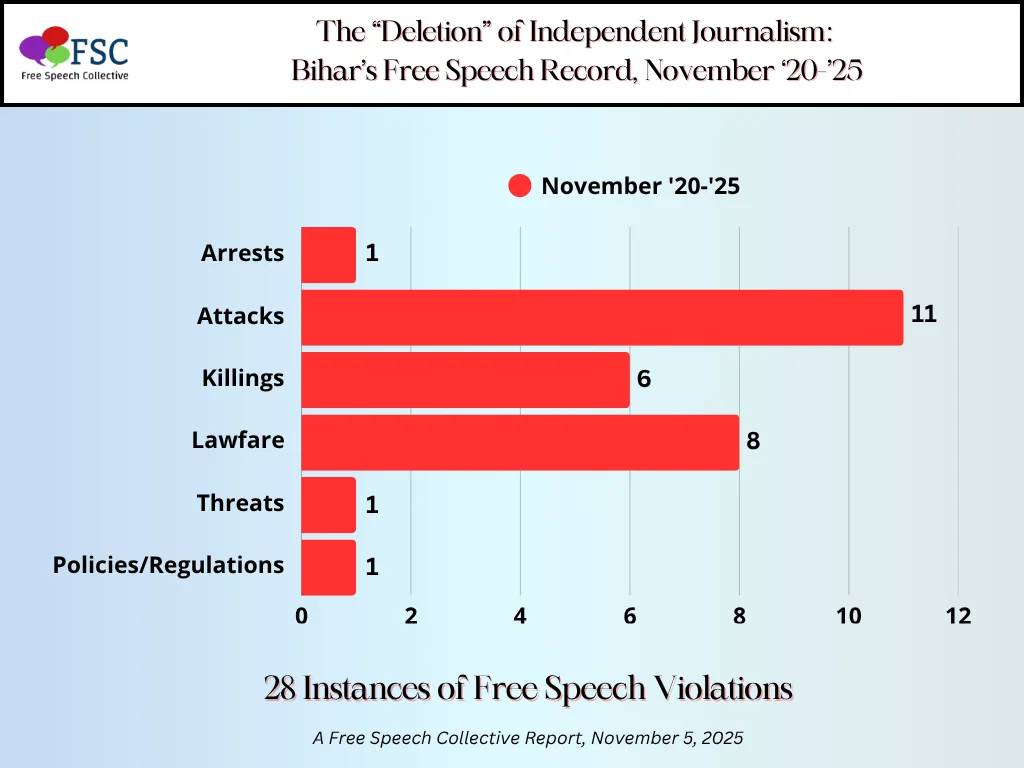 As Bihar once again leads national headlines, incidents like these are deliberately pushed to the fringes of collective memory. The five years from 2020 to 2025 have witnessed numerous instances of the “deletion of independent journalism,” marked by assaults and killings of journalists, according to a report published by the Free Speech Collective, an organisation that monitors violations of free expression in India. The report flags 28 instances of free speech violations during this period, including reports of six killings and eleven attacks. The social and political climate of the state has practically turned journalism into an act of grave danger to life itself, or, at the very least, a path fraught with legal action.