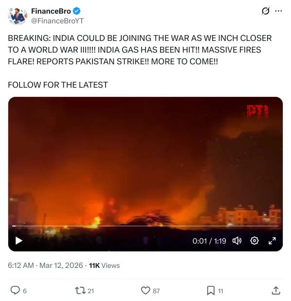Another X user also shared the same video on March 12, with the caption “BREAKING: INDIA COULD BE JOINING THE WAR AS WE INCH CLOSER TO A WORLD WAR III!!!! INDIA GAS HAS BEEN HIT!! MASSIVE FIRES FLARE! REPORTS PAKISTAN STRIKE!! MORE TO COME!!” suggesting that Pakistan has targeted gas pipelines in Delhi and that India could be joining the ongoing conflict in Southwest Asia.