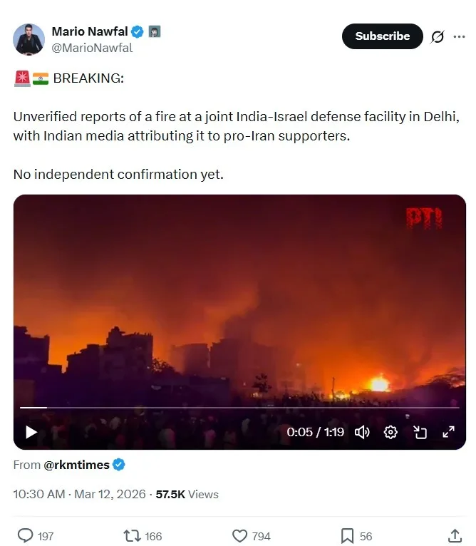 On March 12, Mario Nawfal, a Lebanese-Australian entrepreneur, business influencer, podcast host, and political commentator, shared a video on X (formerly Twitter) featuring a fire incident. The caption reads, “BREAKING: Unverified reports of a fire at a joint India-Israel defence facility in Delhi, with Indian media attributing it to pro-Iran supporters. No independent confirmation yet.” The post allegedly links the fire to pro-Iran supporters in Delhi, India.