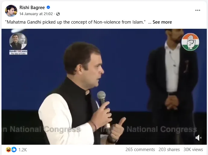 A video clip circulating widely on Facebook since January 14 has sparked controversy by claiming that Congress leader Rahul Gandhi said, “Mahatma Gandhi adopted the idea of ahimsa from Islam.” The clipped video is being shared with captions suggesting that Gandhi credited Islam as the source of Mahatma Gandhi’s philosophy of non-violence.