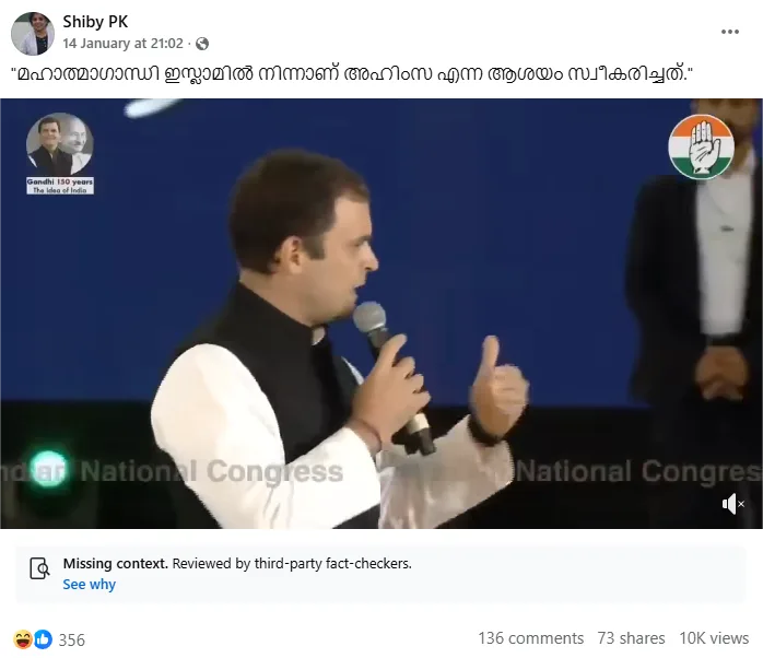 On January 14, a Facebook user named Shiby PK shared a video clip of Congress leader Rahul Gandhi addressing a public gathering. The video carried a watermark of the Indian National Congress and was captioned, “Mahatma Gandhi adopted the idea of ahimsa from Islam.”, in Malayalam.