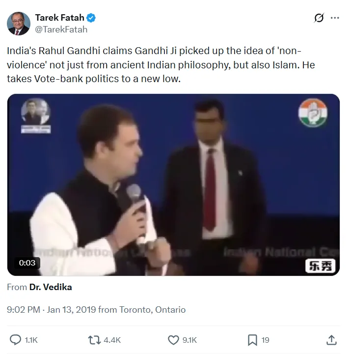 However, a closer examination shows that the viral clip is misleading. The video is taken from a longer speech delivered by Rahul Gandhi in 2019 and has been selectively edited to remove crucial context. In the full speech, Rahul Gandhi is speaking more broadly about the core ethical principles shared across religions and is not making a standalone claim that Mahatma Gandhi derived ahimsa solely from Islam.