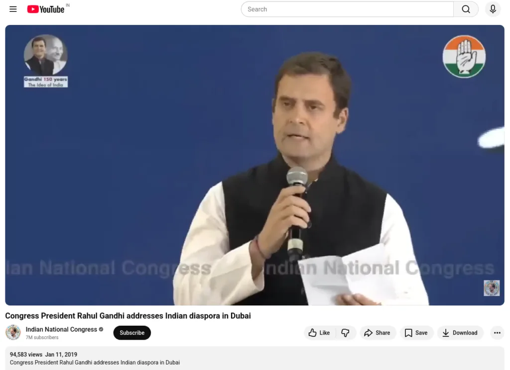 We conducted a reverse image search using a keyframe from the viral video. The search led us to a YouTube video dated January 11, 2019, titled “Congress President Rahul Gandhi addresses Indian diaspora in Dubai.” The video was published on the official YouTube channel of the Indian National Congress.