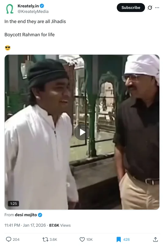 On January 17, Kreately.in shared a video with the caption, “In the end they are all Jihadis Boycott Rahman for life.” The clipped video features AR Rahman during the NDTV program Walk The Talk With A R Rahman dated January 7, 2018, speaking about Sufism.