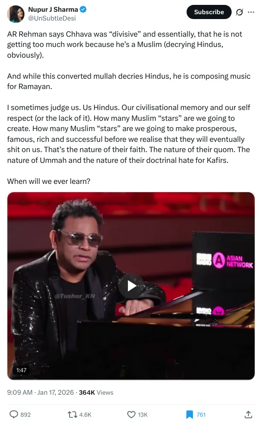On the same day, Nupur J Sharma, Chief Editor, OpIndia, a right-wing media outlet, shared a communal post targeting AR Rahman’s statement on the movie Chhava. The caption reads, “AR Rehman says Chhava was “divisive” and essentially, that he is not getting too much work because he’s a Muslim (decrying Hindus, obviously).”