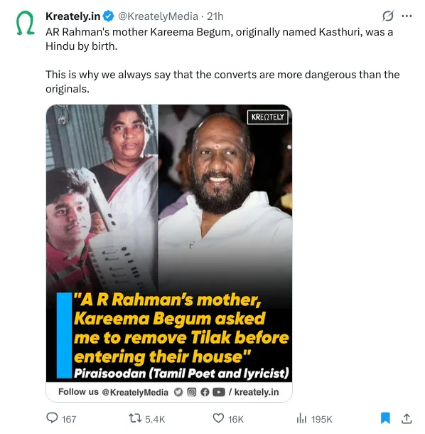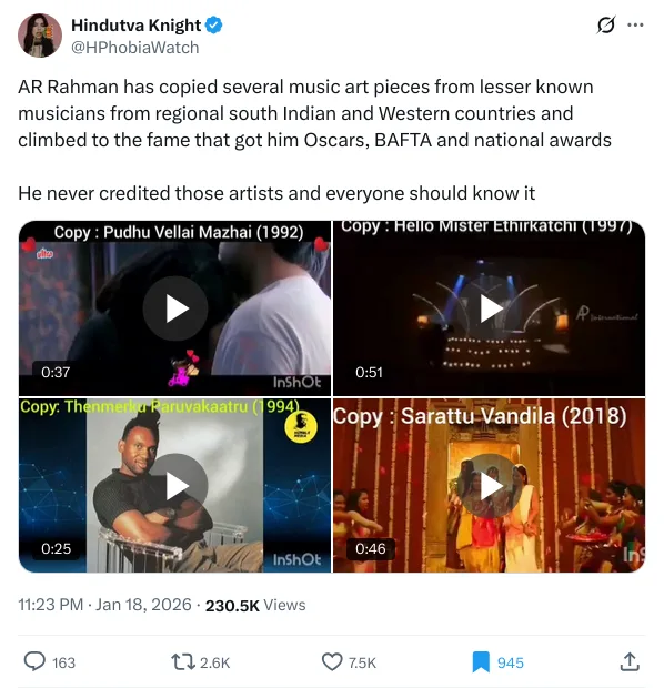 On January 18, Hindutva Knight shared a post accusing AR Rahman of allegedly plagiarising music tracks. The post alleged that the Indian musical composer and record producer copied music tracks from “lesser-known” regional musicians from South India and Western countries.