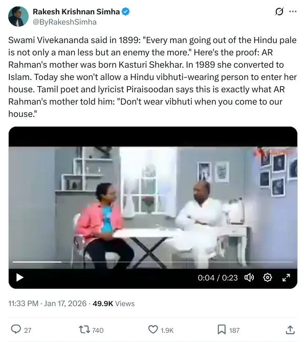A video is widely shared on social media in connection with AR Rahman’s recent remark at the BBC interview, suggesting that he and his family harboured an anti-Hindu mindset.