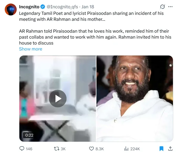 On January 17 and 18, several users shared a 23-second clip from Aadhan Tamil, a YouTube-based digital content channel. The video is taken from a 2020 interview with the late Tamil poet and lyricist Piraisoodan, in which he recounts an experience he had at A.R. Rahman’s house.In the interview, originally aired on July 28, 2020, Pirasoodan shares a bitter experience of being asked to remove the sacred ash from his forehead by AR Rahman’s mother during a work-related visit.