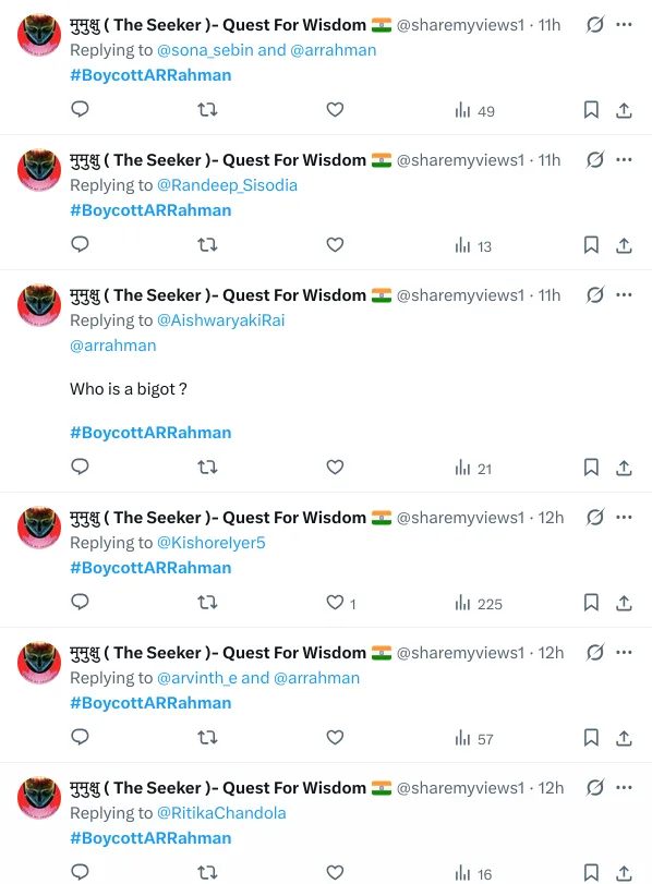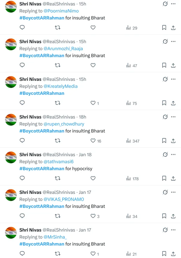 Between January 18 and January 19, we observed several X accounts—namely @RealShrinivas, @sharemyview1, and @leenasez—actively amplifying the trend. Indicating a coordinated behaviour, these accounts engaged with or referenced posts targeting AR Rahman, using identical hashtags and copied text.