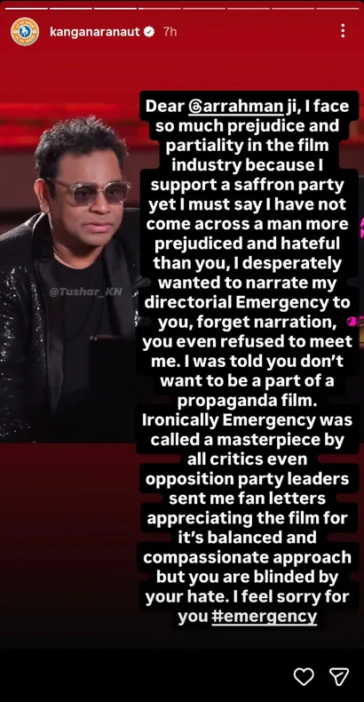 Kangana Ranaut shared a story on January 17, accusing AR Rahman of being prejudiced and hateful. The actor alleged that AR Rahman refused to meet with her regarding her directorial movie Emergency. According to her, he stated his hesitancy to work on a “propaganda” film as a reason.