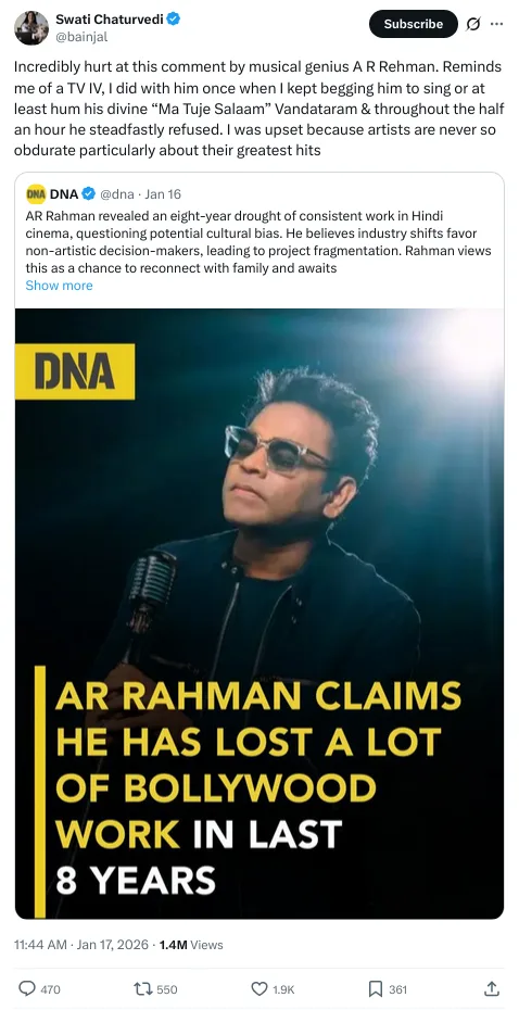 While quoting a DNA IndiaX post on AR Rahman, Print and broadcast journalist. Swati Chaturvedi stated that she is extremely hurt by his recent comments. Additionally, Swati, the author of ‘I am a Troll’ recalled her experience with the music composer during a TV interview. She suggested that during the interview, AR Rahman turned down her multiple requests to sing “Ma Tuje Salaam.” Swati Chaturvedi’s I Am a Troll investigates the machinery behind the right-wing political trolling ecosystem and the systematic use of online harassment as a political tool.