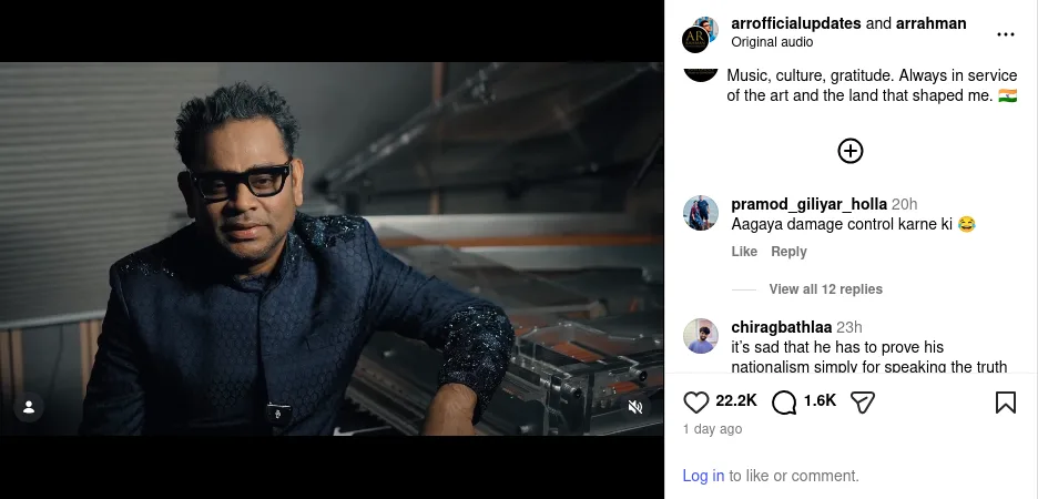 Following the backlash, AR Rahman shared a clarification through his official Instagram account with a caption, “Music, culture, gratitude. Always in service of the art and the land that shaped me. 🇮🇳.”